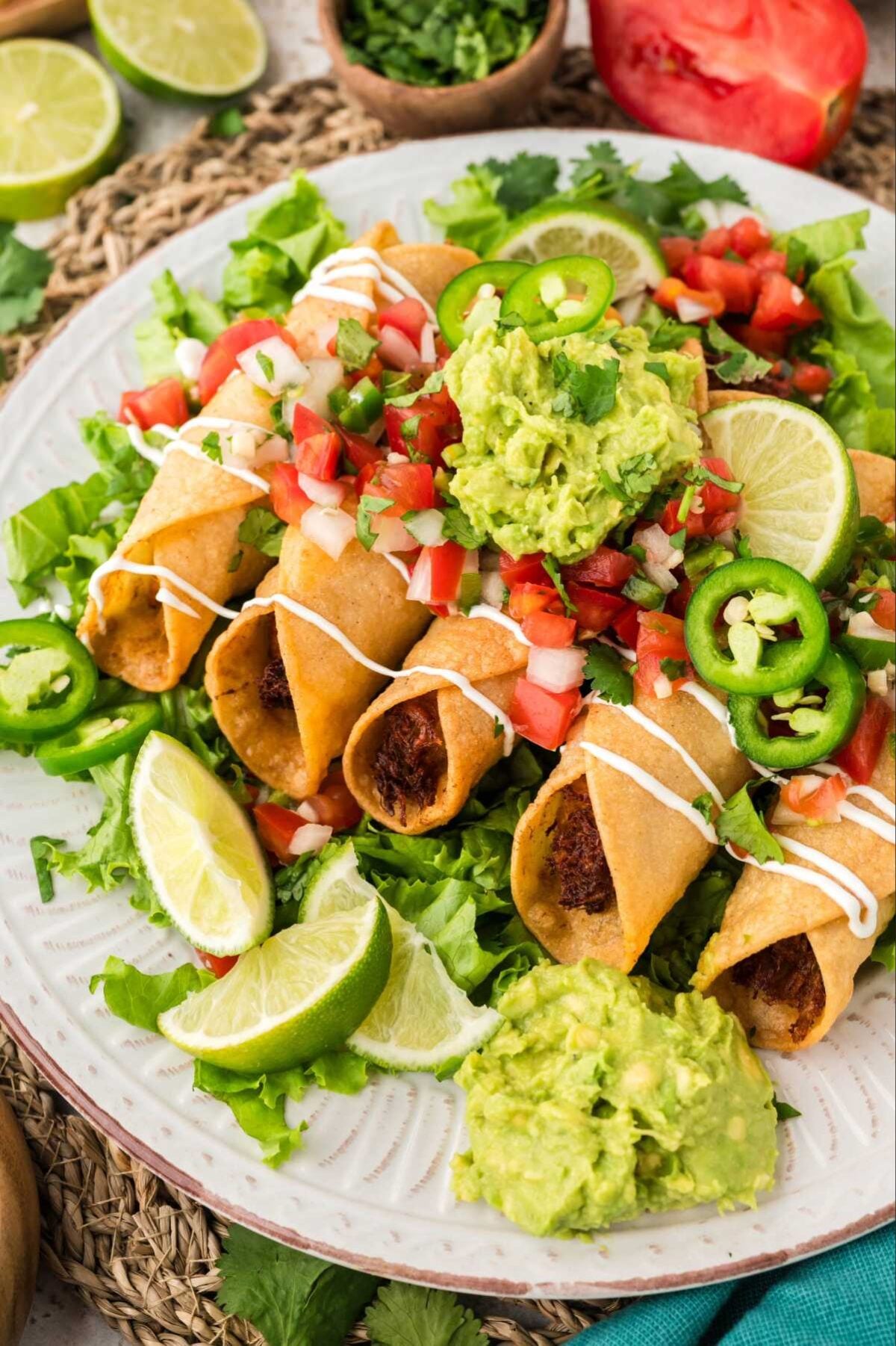 - Transfer to a wire rack set over a paper towel-lined baking sheet to drain excess grease. Repeat until all flautas have been fried. Remove the toothpicks. Serve with desired toppings.