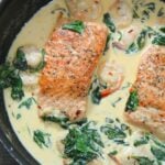 Place the salmon back in the skillet along with the shrimp and spinach.
