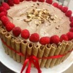 Frost the cooled cakes with the Nutella frosting, raspberries, chocolate hazelnut pirouettes, if desired and enjoy!